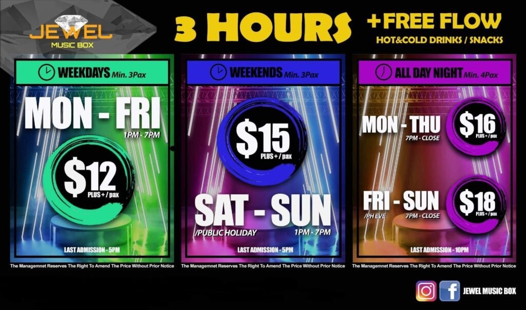 JEWEL MUSIC BOX PASIR RIS beroperasi setiap hari dari pagi hingga larut malam, memberikan peluang kepada pengunjung untuk menikmati sesi karaoke pada bila-bila masa. Dengan penilaian 4.9 daripada 908 ulasan, tempat ini sangat popular di kalangan pencinta karaoke di Singapura.
